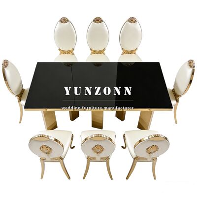 Q3: आपके उत्पादों की सामग्री क्या है? A3: टेबल और कुर्सी स्टेनलेस स्टील फ्रेम, टेबल पर टेम्पर्ड ग्लास; संगमरमर या लकड़ी। कुर्सी कुशन उच्च घनत्व वाले स्पंज और उच्च गुणवत्ता वाले चमड़े या कपड़े से बने होते हैं।