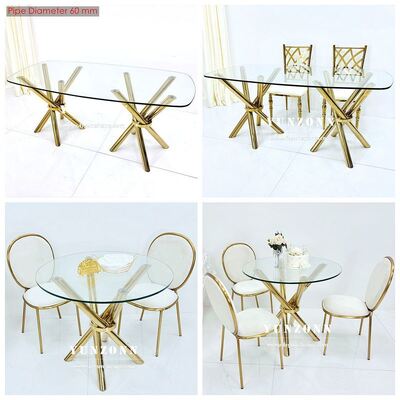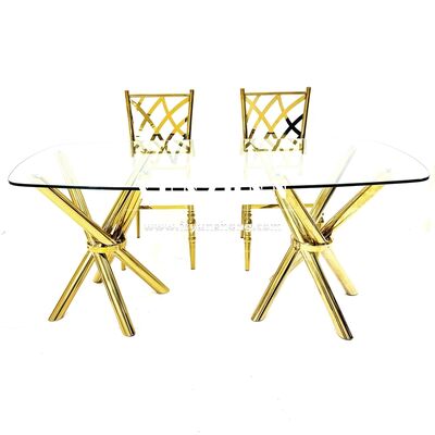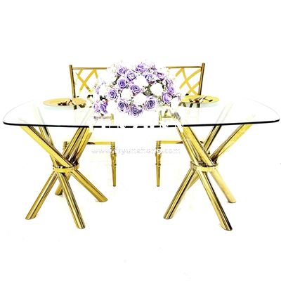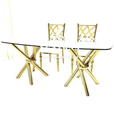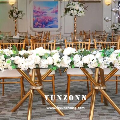 | उत्पाद का नामः | हल्के और स्थिर सस्ते स्वर्ण स्टेनलेस स्टील क्रॉस-लेग पारदर्शी ग्लास इवेंट शादी भोज की मेज |