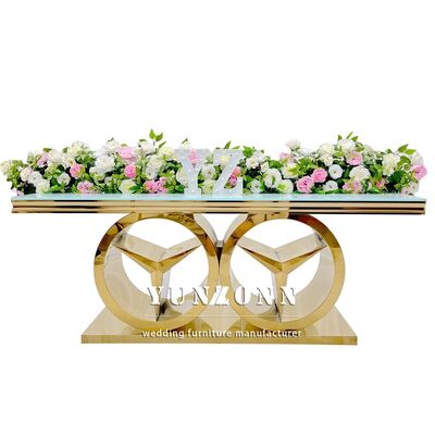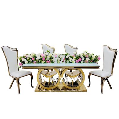 | उत्पाद का नामः | बेन्ज़ बेस के साथ आधुनिक स्वर्ण आयताकार भोजन तालिका बाहरी और होटल उपयोग के लिए लक्जरी शादी समारोह फर्नीचर ग्लास/एमडीएफ शीर्ष |