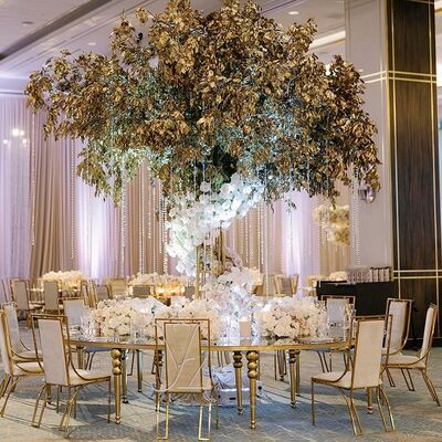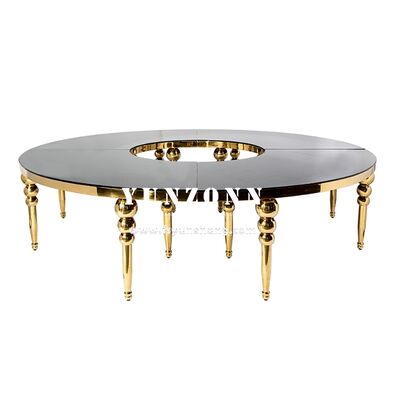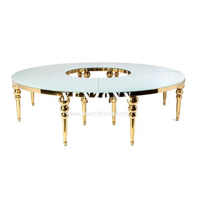 | उत्पाद का नाम: | होटलों, रेस्तरां, शादियों और बाहरी उपयोग के लिए गोल्ड और व्हाइट सर्पेंटाइन डाइनिंग टेबल, व्हाइट ग्लास टॉप के साथ |